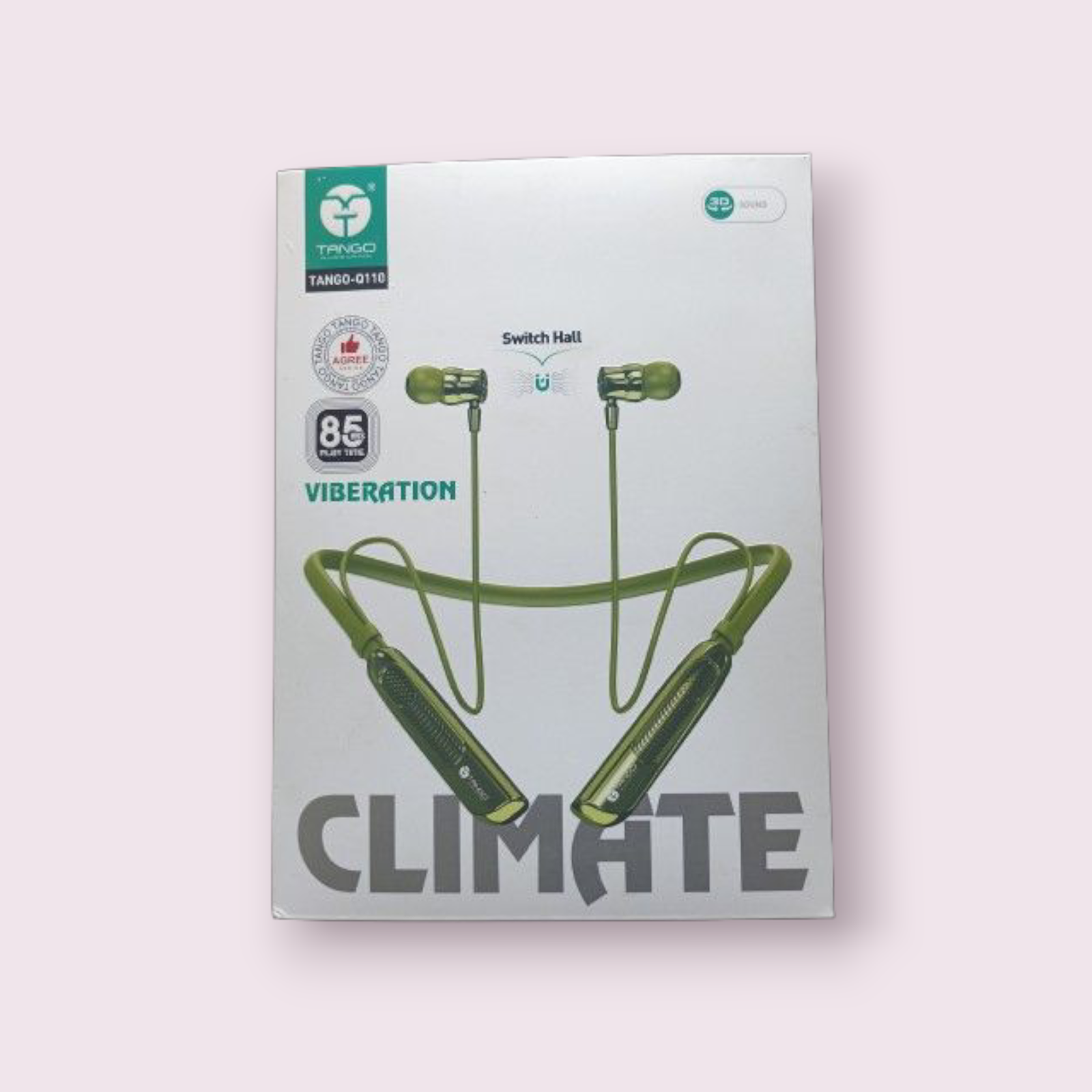 These are wireless neckband earphones labeled “CLIMATE” by Tango, model TANGO-0110. The packaging highlights the following features: