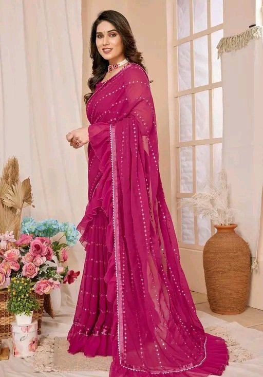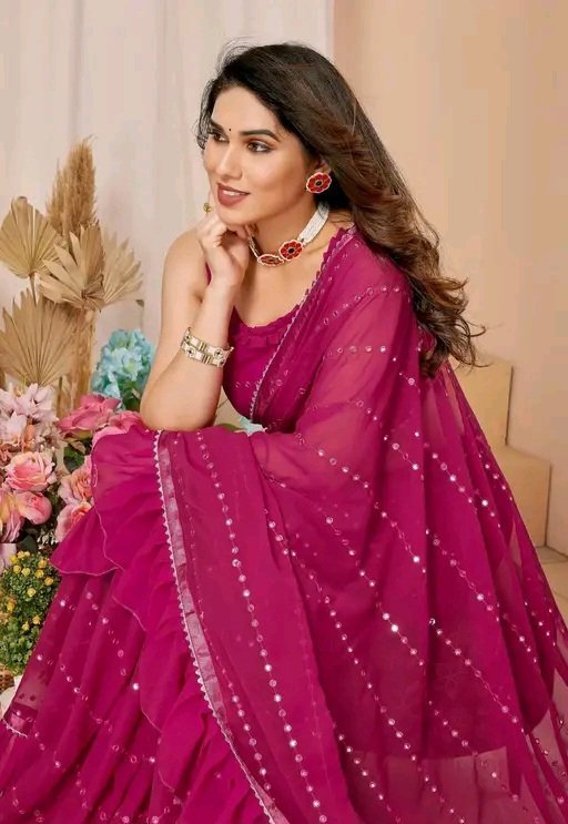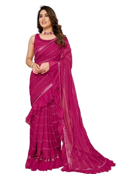 This exquisite Georgette silk saree features intricate mirror work and Ele. gant. ruffles, presented in a stunning pink hue. Designed for convenience, the one-minute saree comes with pre-stitched pleats and a size-adjustable belt, ensuring a perfect fit and effortless draping. Ideal for both casual and formal occasions, this saree combines traditional craftsmanship with modern functionality, making it a must-have addition to any wardrobe. (G