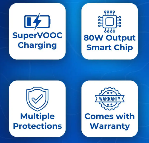Superfast warp charge technology delivers 80W MAX of charging power.6 Months Replacement WarrantyVoltage protection, Over current protection, Over charge protection, Short circuit Protection, Over heat protection, Over discharge protection
